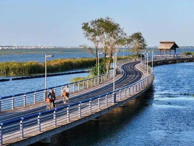 ✦ 国内少见的“亲水不扰水”生态步道体系,50公里环湖自行车道采用环保透水材料,保留超70%的原生植被,沿途由青山周平设计的水泽驿站,宠物友好与湖景咖啡使其成为亲子萌宠打卡点。