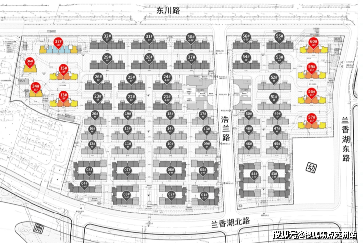 其中34#东边户靠近地下车库出入口,西边户靠近非机动车出入口,36#南向约13米是一个配电房,尤其是西边户是正对着的,37#北侧为绿化+河道,再往北就是东川路,东单元东边户紧挨着垃圾房;
